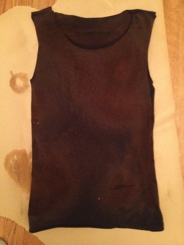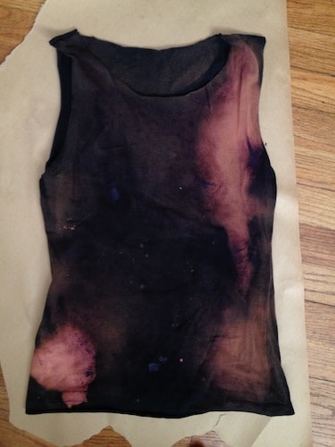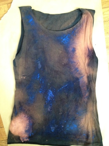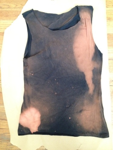 На пол обязательно кладем бумагу или клеенку. А в бутылке смешиваем воду с отбеливателем в пропорции 1:1. Наносим жидкость на футболку неравномерно. Сразу после нанесения пятна будут оранжевого цвета. Оставляем футболку на один час.