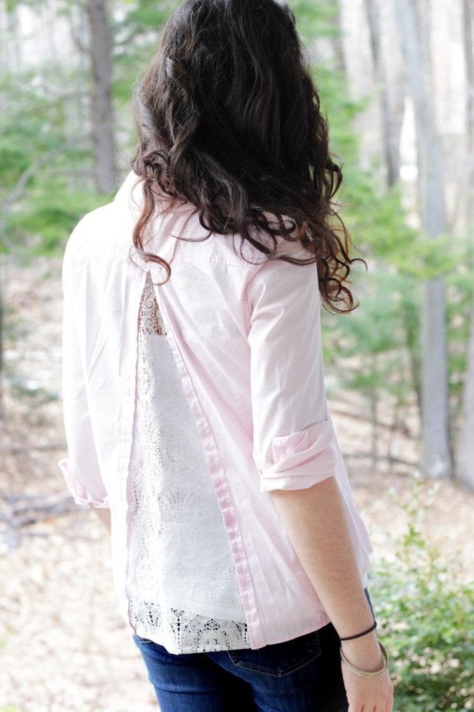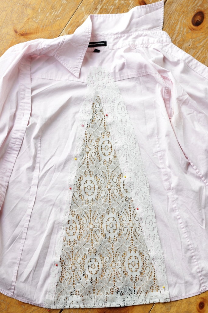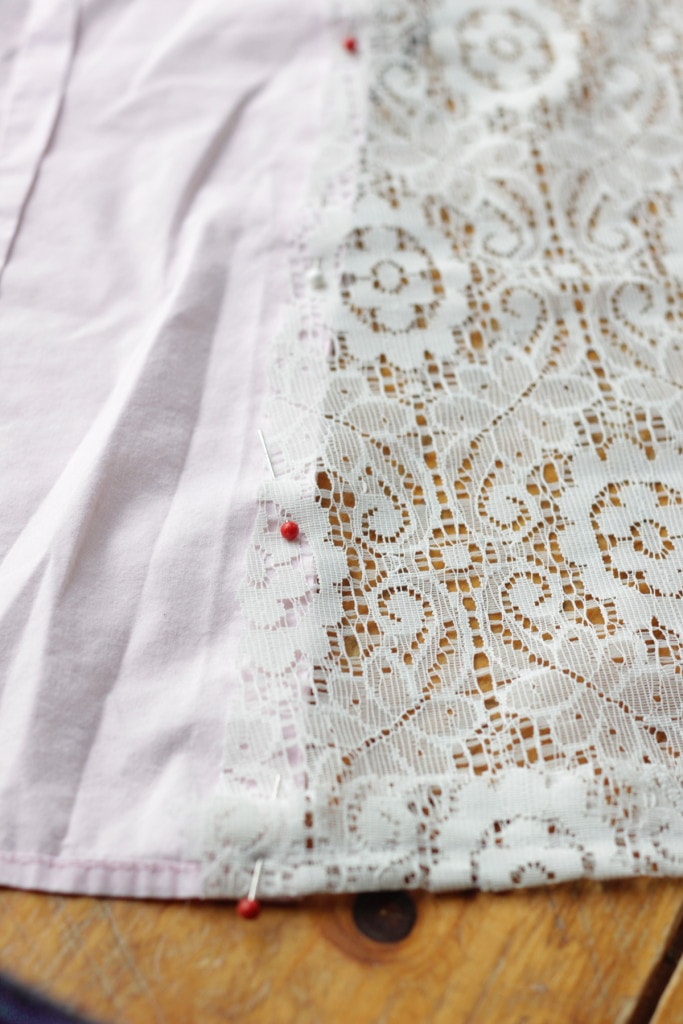 Прикрепляем с внутренней стороны кружево к рубашке булавками. И пришиваем на швейной машинке или вручную.