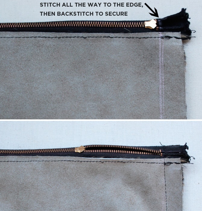 Сшиваем молнию с кожей при помощи швейной машинки. Если кожа слишком толстая, то можно сделать это вручную, используя большую иглу или шило. После этого вынимаем булавки.