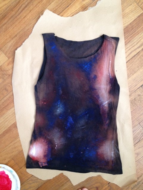 Губкой наносим фиолетовую краску на белые пятна и немного на черную часть футболки.