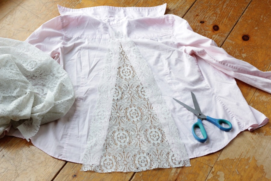 Раскладываем края рубашки так, чтобы получился треугольник и прикладываем кружево. Вырезаем его, оставляя для шва 2 см с каждой стороны.