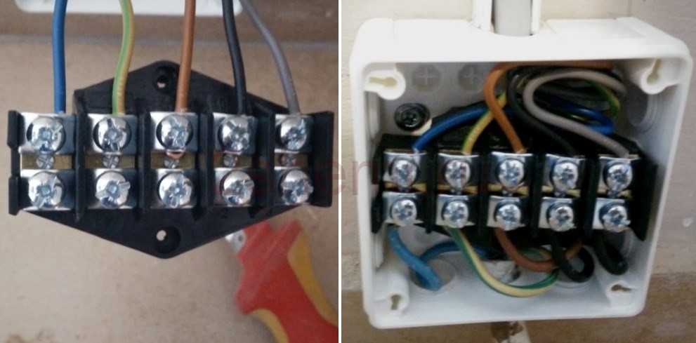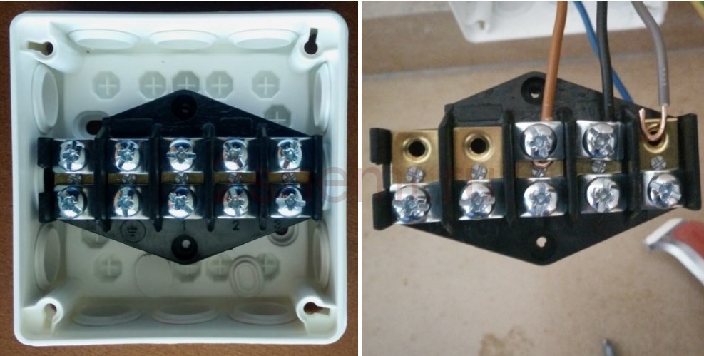 Чтоб провода не натягивались, лучше сделать петли на концах проводов (рисунок справа) при подключении. Как видите на приведенных выше рисунках, использована специальная клеммная колодка с винтовыми клеммами для трехфазных проводников, нейтрального и защитного проводника. Её преимуществом является то, что после открытия крышки можно увидеть все что в ней связано.