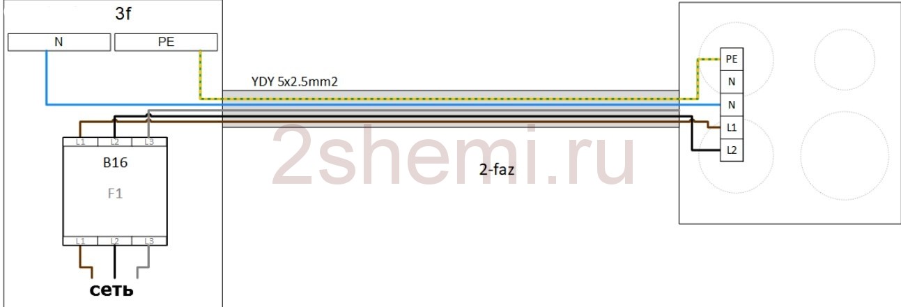 Как видите, в этом случае не используется серый шнур питания (L3). Примеры чертежей из инструкции индукционной варочной панели, относящиеся к приведенной выше схеме: