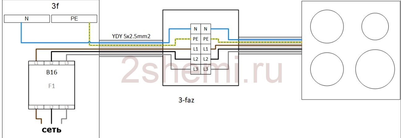 Вот как выглядит схема подключения, которая часто используется в реальных условиях. На этапе установки используется индукционная варочная панель, поэтому кабель из распределительного устройства оканчивается в монтажной коробке. Если индукционка поставляется с кабелем, она выводится на коробку, если нет — нужно купить кабель OMY (ШВВП) 5 х 2,5.