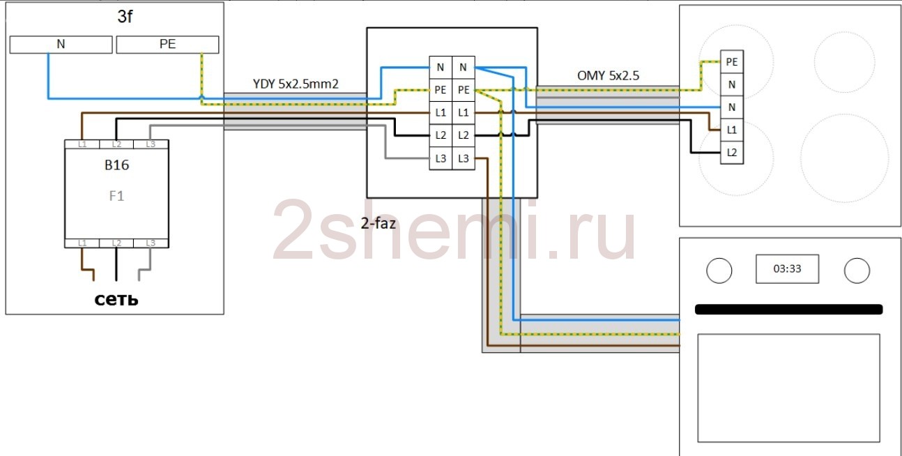 Кроме того, неиспользуемая фаза (в данном случае L3) тоже подключается к духовке для обеспечения равномерной загрузки фазы. Печь также может поставляться с отдельным кабелем 3 х 2,5 от распределительного устройства (и подключается к однофазному переключателю максимальной токовой защиты). Затем в случае повреждения одного из устройств другое может быть использовано без каких-либо проблем.
