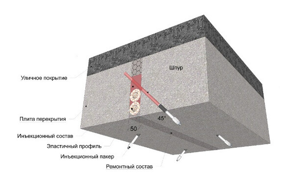 - Потолочная. Техника инъектирования аналогична предыдущему варианту. Эпоксидную смолу вводят по аналогичной методике. Этот материал имеет повышенный уровень вязкости, поэтому материал не будет вытекать из отверстия.