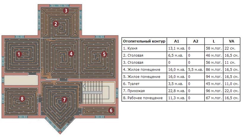 К итоговому значению добавляют отрезок трубы, проложенной от коллектора до разводки теплого контура как на обратке, так и на подаче.
