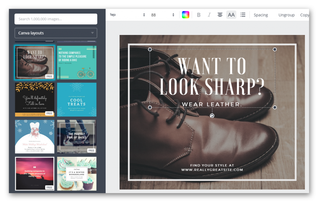 Главный плюс Canva — огромное количество дизайнерских шаблонов и фотографий. В платной версии, по сообщению разработчиков, их около миллиона. В бесплатной — меньше, но все равно много. Свои картинки загружать тоже можно.