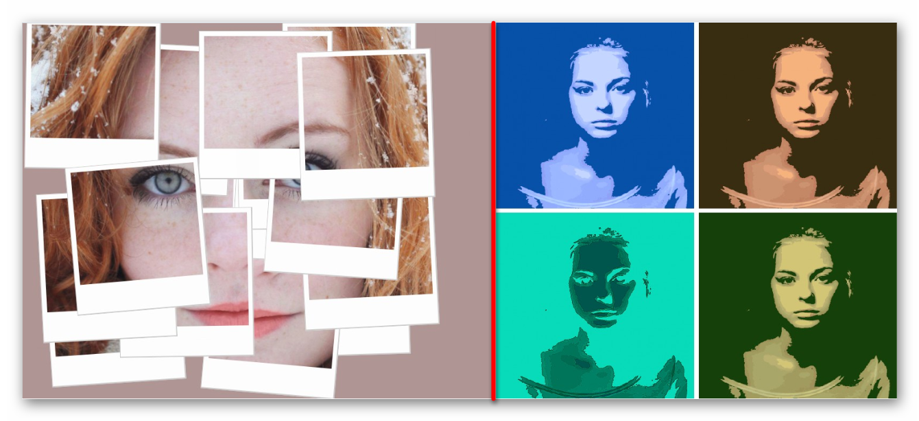 Слева — коллаж в стиле полароидных снимков, справа — поп-арт постер