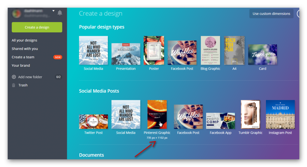 В Canva есть 62 типа изображений под разные цели. Можно делать картинки для соцсетей: квадратные — для Инстаграма и «Вконтакте», прямоугольные — для Фейсбука. Оформляйте слайды для презентаций, рисуйте обложки для буклетов… Если нужно — установите свой размер изображения.