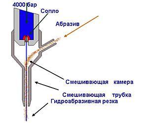 Инновационный способ. Резка осуществляется смесью воды и абразива (песка), которая под давлением подается через узкое сопло. Этот способ позволяет разрезать изделия в толщину до 30 сантиметров.