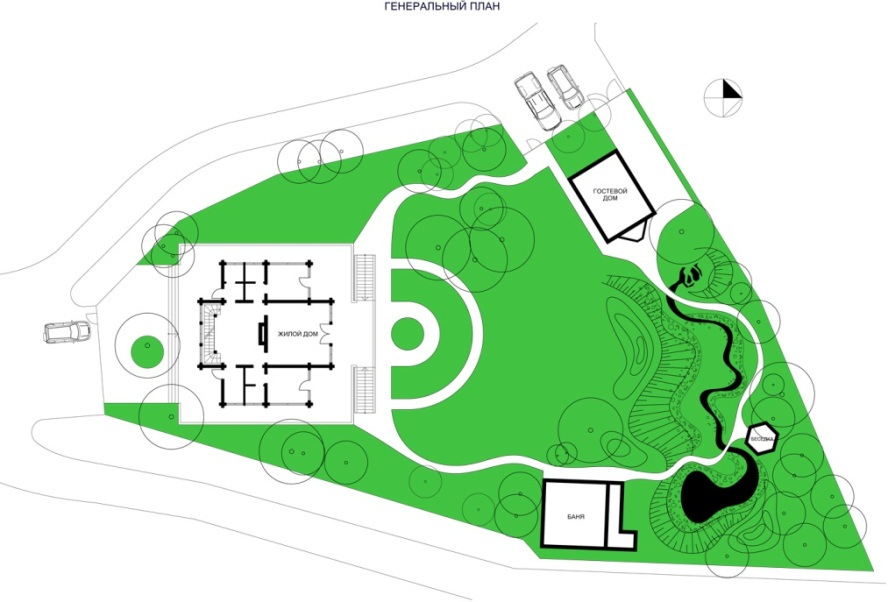 Генеральный план земельного участка. На чертежах указывают расположение дома, хозяйственных построек, элементов благоустройства территории. Генплан разрабатывают в масштабе 1 : 200 или 1 : 500, а затем отправляют на согласование в отдел архитектуры и строительства.