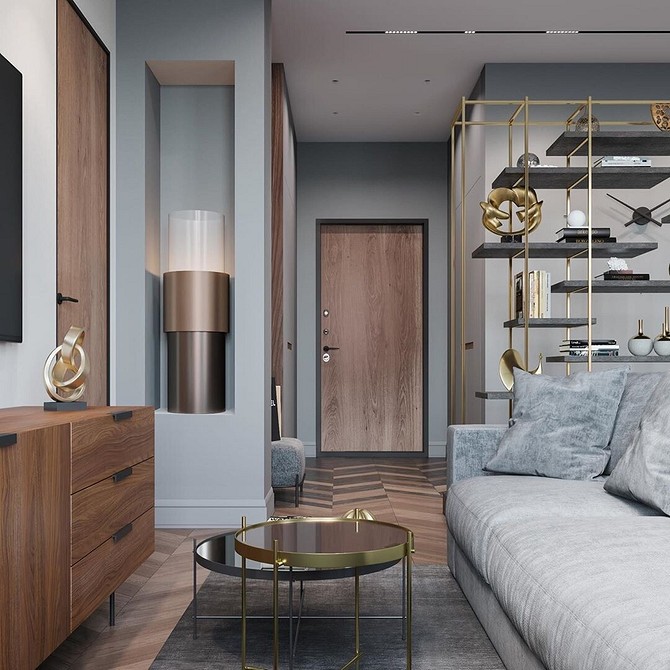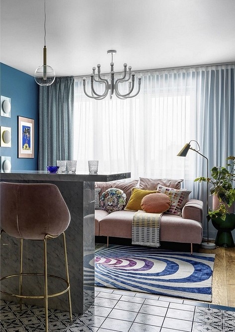 20 квадратов — метраж, который подходит для смелых экспериментов с отделкой. Скомбинируйте разные принты и фактуры в рамках одного оттенка — в 2020 году этот ход будет в тренде. В современном дизайне нет особенных правил сочетаемости узоров или цветов, поэтому подключайте свой творческий потенциал к выбору оформления стен. Экспериментировать можно и в рамках одного цвета — создайте монохромный интерьер и разбавьте его акцентами.