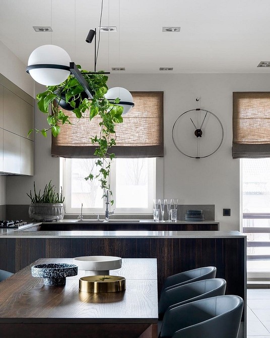 Для обеденной зоны нужны только свои потолочные светильники, которые не будут давать собственной тени. Их количество выбирается в зависимости от мощности, дизайна комнаты и размеров стола.