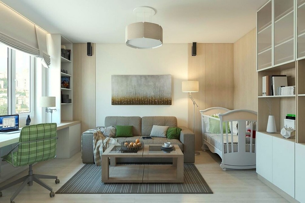 - в нем присутствует минимальный набор мебели в светлых и пастельных тонах;