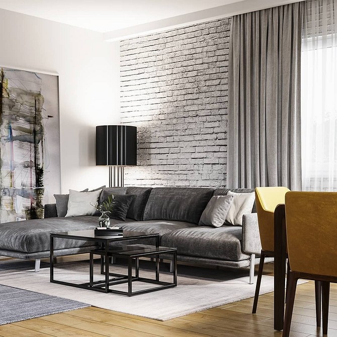 Любителям нестандартных решений придется по вкусу ансамбль, состоящий из потертых кирпичных стен, белого потолка, деревянного пола, дополненного крупным ковром с черными угловатыми узорами, а также голубого прямоугольного дивана, деревянного столика и стула. Повесьте на потолок трековые светильники, а на окна – плотные зелено-коричневые шторы.