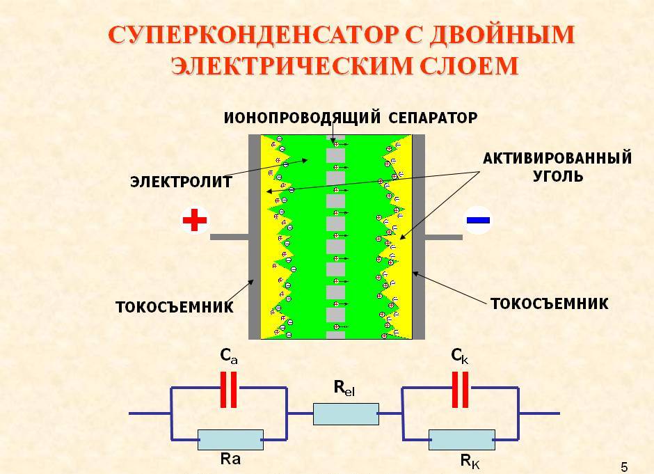Двойной слой в такой конструкции выполняет роль конденсатора поверхностного. Благодаря электролиту два слоя объединяются в последовательную цепочку.