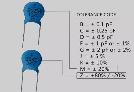 Керамические конденсаторы обладают плоской круглой формой и двумя контактами. На корпусе кроме основных показателей, указывается допуск отклонений от номинальной емкости. С этой целью используется определенная буква, проставляемая сразу же после цифрового обозначения емкости. Например, буква «В» соответствует отклонению + 0,1 пФ, «С» – + 0,25 пФ, D – + 0,5 пФ. Эти значения применяются при емкости менее 10 пФ. У конденсаторов с емкостью более 10 пФ буквенные обозначения соответствуют определенному проценту отклонений.