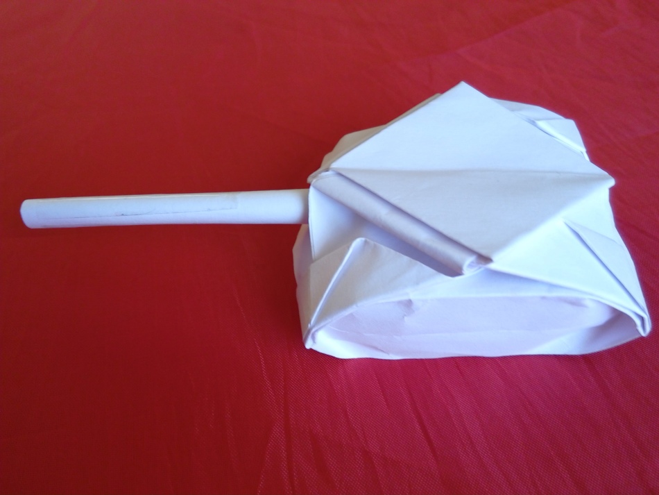 Намного сложнее техника оригами. Для того, чтобы сделать такой танк, сначала разберитесь в схеме самостоятельно, а потом объясните ребенку.