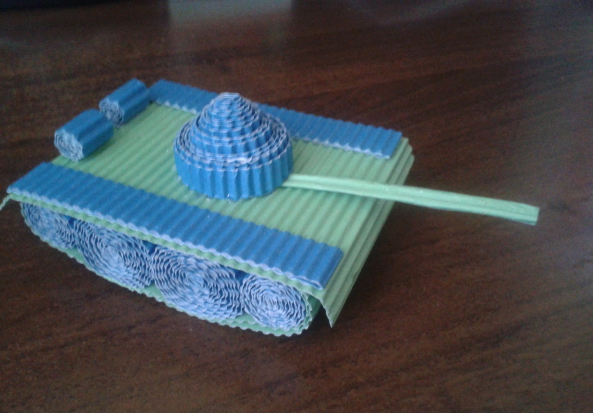 Совсем немного времени займет сделать танк из гофрированного картона. Для этого вам понадобится: гофрированный картон разных цветов, ножницы и клей.
