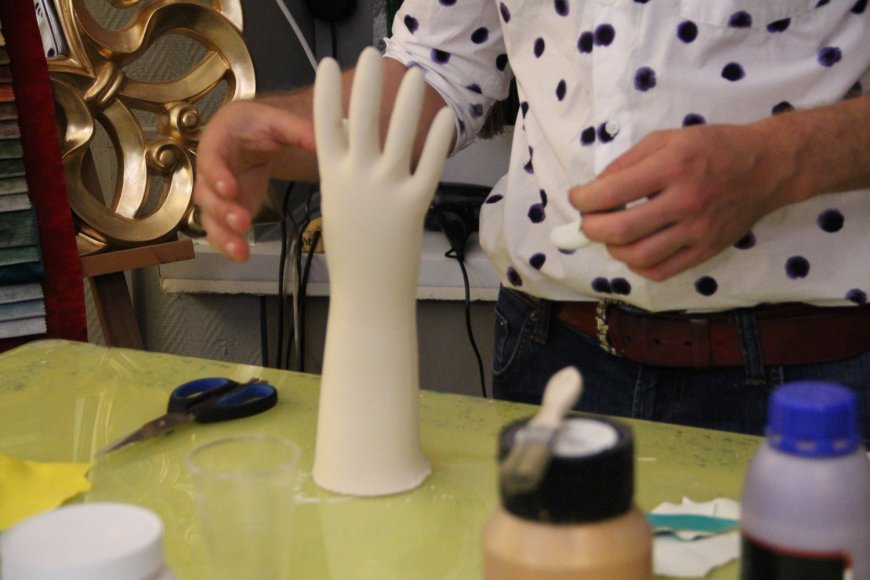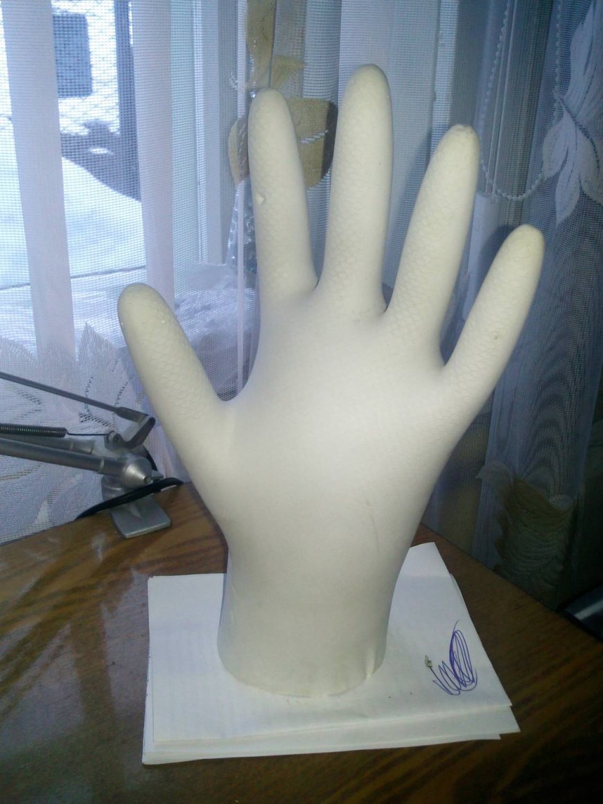 После заполнения перчатки придерживая ее верх необходимо немножко постучать по ней или по корпусу заготовки, чтобы раствор равномерно распределился по форме перчатки, не оставляя пустот. После затвердевания руки срезаем перчатку.