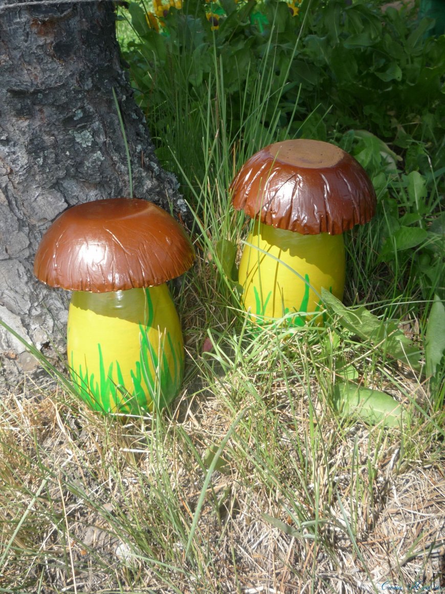 Грибы в саду всегда выглядят оригинально и привлекательно. Изготовить поделки в виде грибов очень просто. Обрезаем донышко у пластмассовой бутылки и завинчиваем крышку.