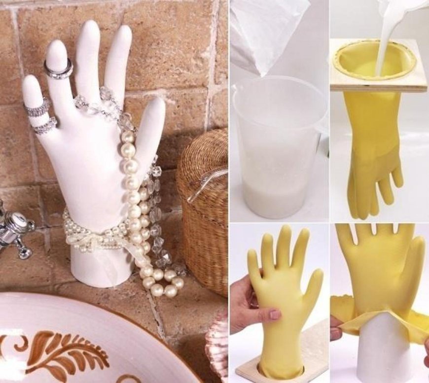 Отрезаем дно у приготовленной пластмассовой емкости. Ставим емкость на основание и через ее горлышко опускаем в него перчатку. Края перчатки крепко закрепляем на горлышке бутылки. Разводим гипсовый раствор и заполняем им перчатку.