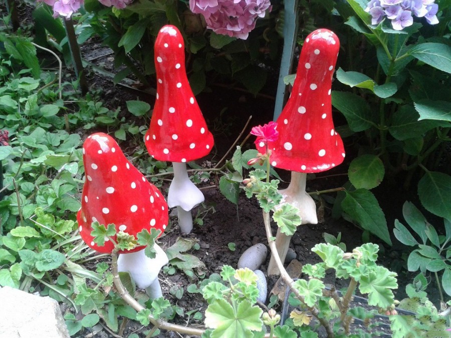 Для садового участка можно приготовить грибочки, фигурки гномиков или сказочных персонажей, насекомых или животных и т.д. все зависит от желания и художественных возможностей владельцев. Несомненно, что такие изделия станут интересны детям и привлекут их в садовую часть дачи.