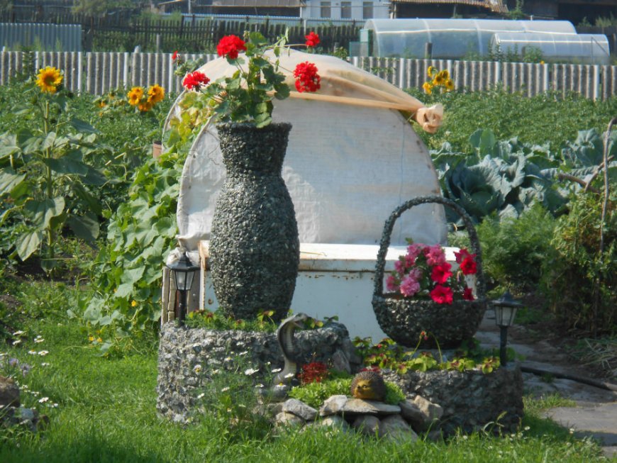 Для декорирования зоны отдыха, жилого дома и хозяйственных построек можно изготовить различные вазы, кашпо, подставки для цветов, декоративные листья, домики и вывески к ним, фигурки животных и птиц или мультипликационных и сказочных героев.