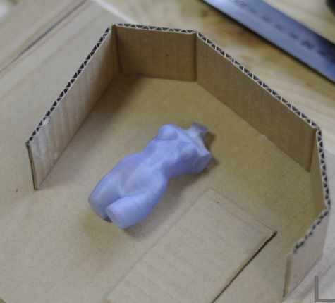 Непосредственно перед литьем в гипс следует произвести смазывание опоки и смешивание раствора для литья. Заливать растров в отверстие следует тонкой струйкой, обязательно давая воздуху возможность выйти. После заливки форму надо повращать и слегка потрясти, чтобы добиться максимального прилегания раствора к мелким деталям рельефа.