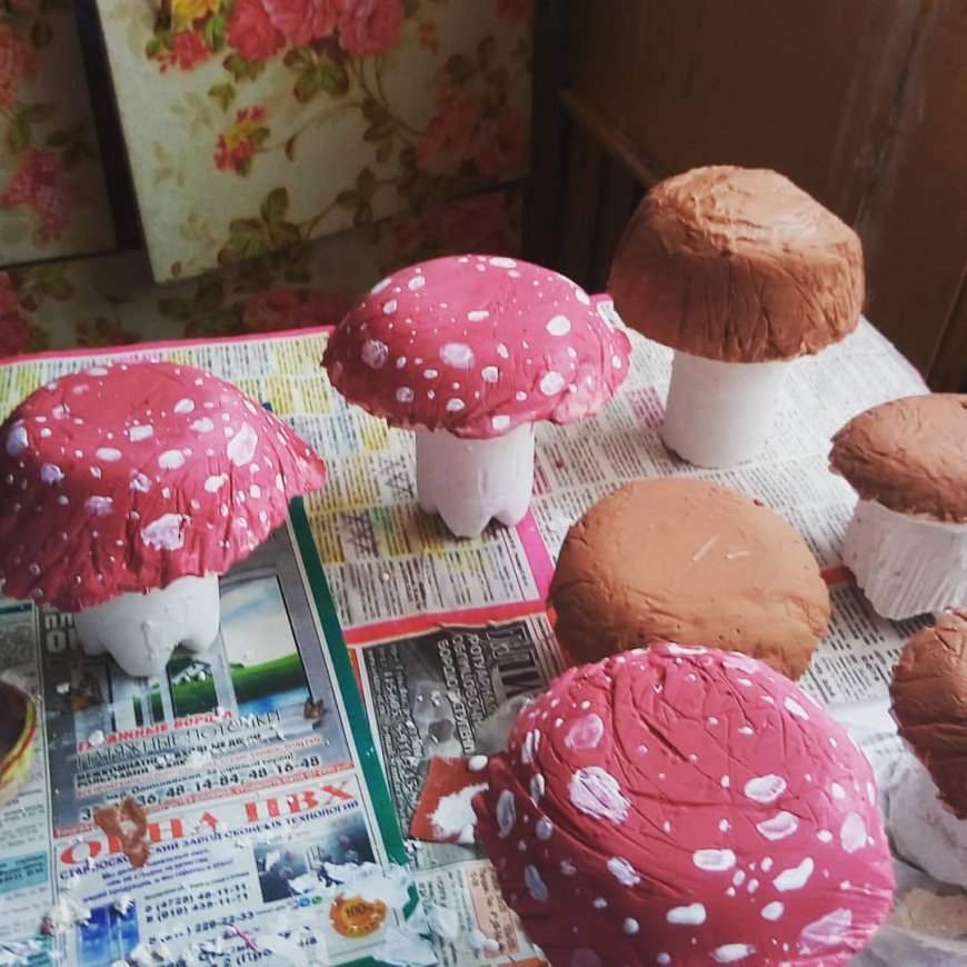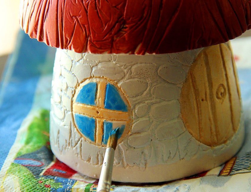 После затвердевания готовый гриб достается из тарелки и ошкуривается наждачной бумагой. Для его окраски применяются различные краски, это зависит от его наименования. По окончании работ полученное изделие покрывается лаком и высаживается на свое место в саду.