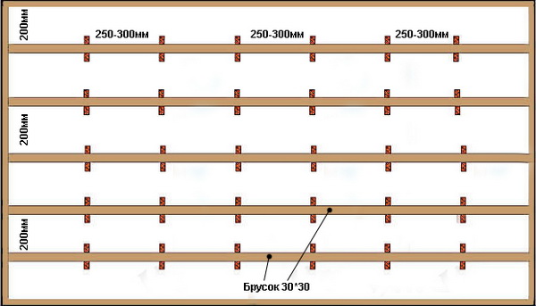 Предварительно готовится основание для отделки, и для этих целей следует избавиться от старой отделки и заделать крупные трещины. Далее следует подготовить бруски с сечением 50 на 50 и прикрепить их к основанию, начав от одного из углов помещения.