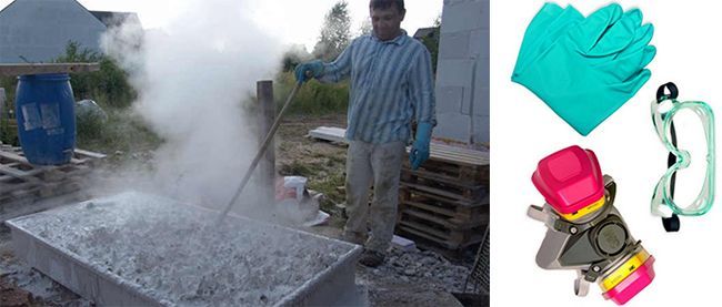 Важно! При гашении происходит химическая реакция (довольно бурная), которая сопровождается большим тепловыделением. Поэтому использование очков, защитной одежды, резиновых перчаток и сапог обязательно