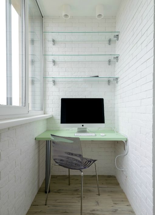 Если балкон совсем маленький, можно ограничиться небольшим столом, стулом и парой полок. В этом случае в помещении точно не будет ничего лишнего, тем самым будут созданы оптимальные условия для работы.