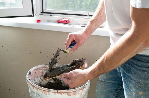 - Маленьким шпателем набирают заранее разведенный раствор и кладут его на шпатель большего размера (шириной 10-12 см).