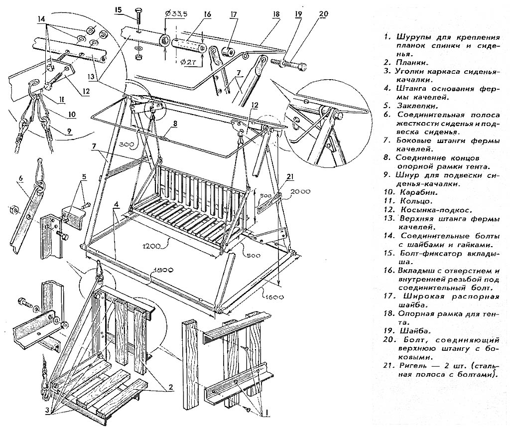 Свои собственные качели чаще всего делают из дерева: роднее оно, уютнее и работать с ним проще. Но если, скажем, всем миром оборудовать детскую площадку, тут нужна уже конструкция попрочнее и несгораемая, чтобы и сорванцов не приходилось то и дело одергивать, и хулиганью, которое, увы, никак не переведется, повредить качели было трудно. На такой случай – на рис. ниже чертеж классических, так сказать, дворовых качелей из металла: труб, уголка, полосы, проволоки-катанки, с навесом. Мы же в дальнейшем больше внимания уделим деревянным качелям, кроме тех случаев, когда металл необходим по прочности: для спортивного уголка подростку и др.