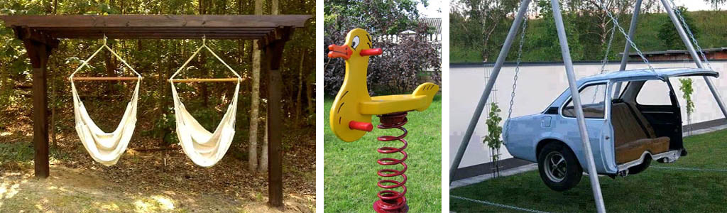 Раз уж речь пошла о забавных качелях, коснемся еще кой-чего из них, но вполне пригодного для употребления по назначению. Напр., качели-гамаки, слева на рис., хотя гамак уже сам по себе лежачие качели. Наверное, есть в покачивании с дополнительными степенями свободы что-то, что владельцам нравится. Во всяком случае, вреда не будет.