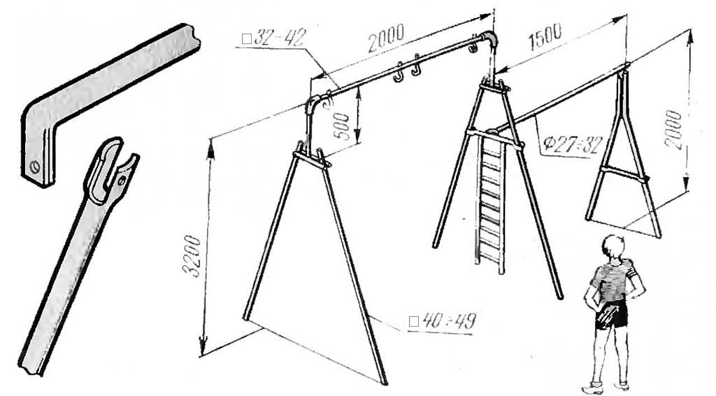 - Еще лучше, если места достаточно, поставить сбоку дополнительную опору пониже, чтобы в придачу получился и турник, см. рис. ниже. В таком случае весь спортивный уголок, кроме перекладины турника, предпочтительнее сделать из профильной трубы, тогда все сооружение получается прочнее, дешевле и проще технологически.