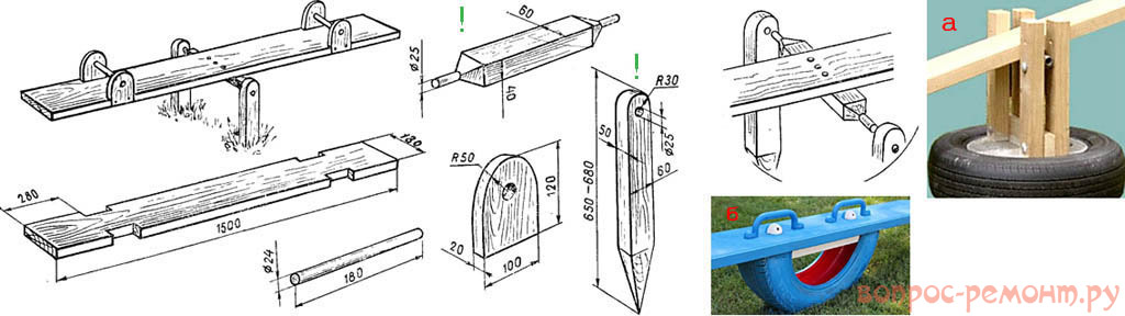 Детали, отмеченные (!), выполняются из твердого мелкослойного лиственного дерева – дуба, бука, граба, ореха. Концы оси маятника можно не обтачивать до идеально круглого: достаточно обстругать более-менее ровно, чтобы встали в гнезда с небольшим натягом, и несколько раз покачать доску, приработаются. Если же волокна в оси и опорных стойках ориентированы взаимно перпендикулярно (что соблюсти элементарно, вырезав их из одной доски), то качели прослужат много лет, а трущиеся поверхности скоро станут зеркально-гладкими и прочными, как из стали на станке выточены.