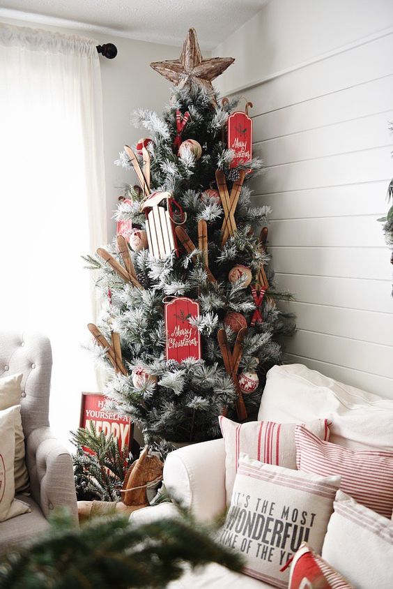 Очень эффектно под елочкой будут смотреться саночки. Можно попробовать отреставрировать старенькие семейные саночки, которые возможно долго ждали своего часа на чердаке или визуально состарить новенькие современные саночки. Для этого их нужно покрасить в белый цвет, и пройтись сверху почти сухой кистью, предварительно погруженной в серую краску. Таким нехитрым способом можно создать тот самый недостающий винтажный эффект.