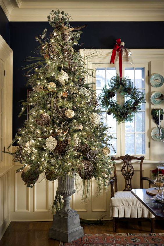 Если вы предпочитаете создание более строгого дизайна, можете расположить украшения и гирлянды в вертикальном направлении. Для придания такой елочке более гармоничного вида в некоторых местах можно завязать банты или использовать мишуру.