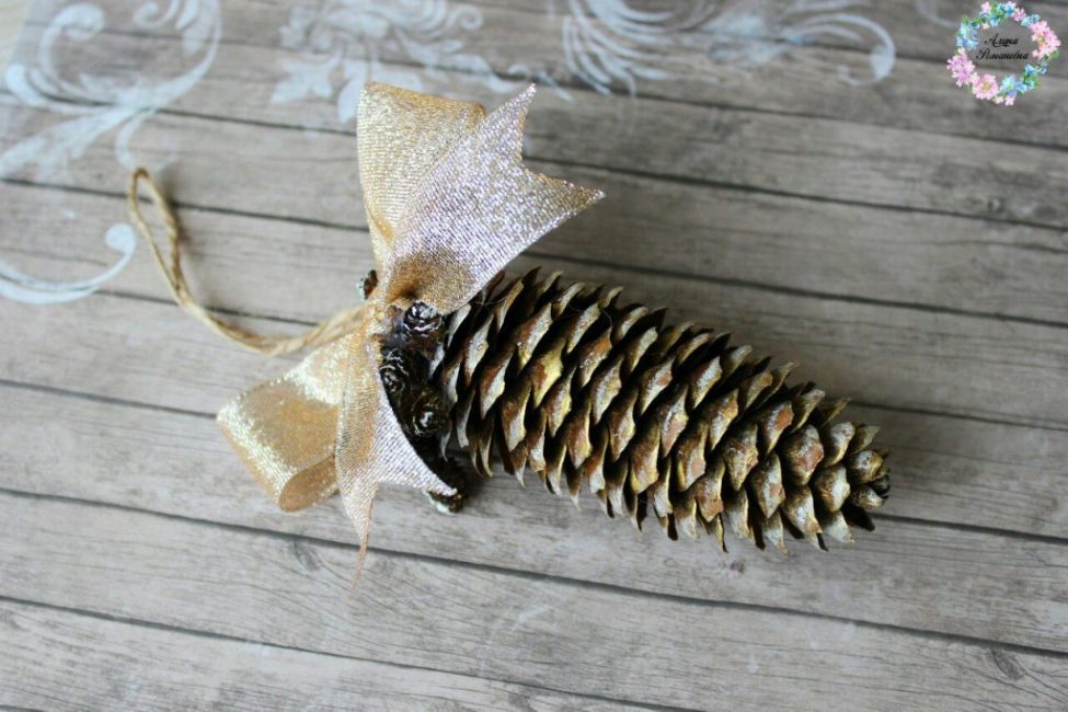 Теперь они подойдут для изготовления гирлянд, подвесок или отдельных элементов декора, которые вешаются на елку с помощью атласных лент. Шишки с помощью кисточки можно дополнительно припудрить золотой или серебряной акриловой краской.