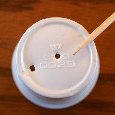 - На дне стакана проделайте в центре круглое отверстие острой палочкой, как показано на фото.