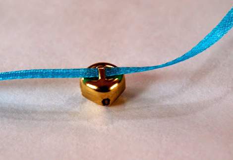 4. Кусочек ленты, длиной 25 см, сложите пополам. Один конец ленты проденьте через бубенчик.