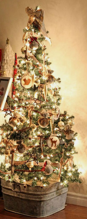 - Стиль кантри – это использование самодельных игрушек, деревянных фигурок, связанных своими руками снежинок, шишек. Расположение, преимущественно, спиральное либо горизонтальное. Такая ёлочка приглянется тем, кто любит естественность декора. Гирлянды для этой композиции тоже лучше сделать самостоятельно из бумаги, натуральной текстильной ткани, желудей, орехов и сухофруктов.