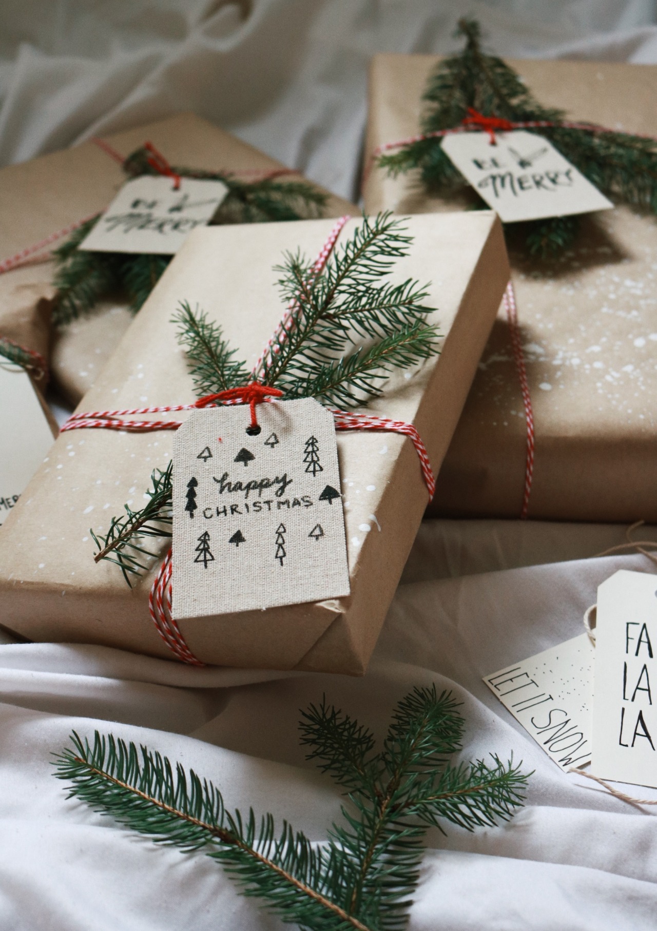 Последним шагом станет декор подарка. Если либо новогодний, то под верёвку можно положить небольшую еловую ветвь.