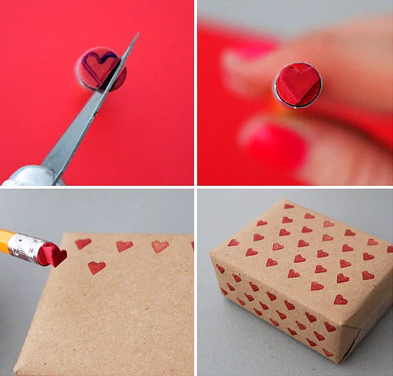 Дома для упаковки есть только обычная бумага? Скучная и не интересная. Преобразить ее поможет обычный карандаш, точнее резинка на торце. Можно сделать как горох, так и звездочки, сердечки и т.д. Вырезать резинку можно канцтоварным ножиком.