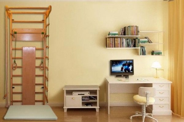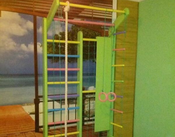 - На стену. Таким образом, шведскую стенку крепят к кладке стен, путем ввинчивания соответствующих метизов.