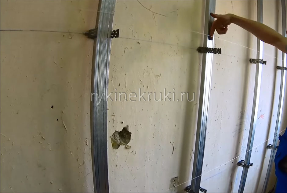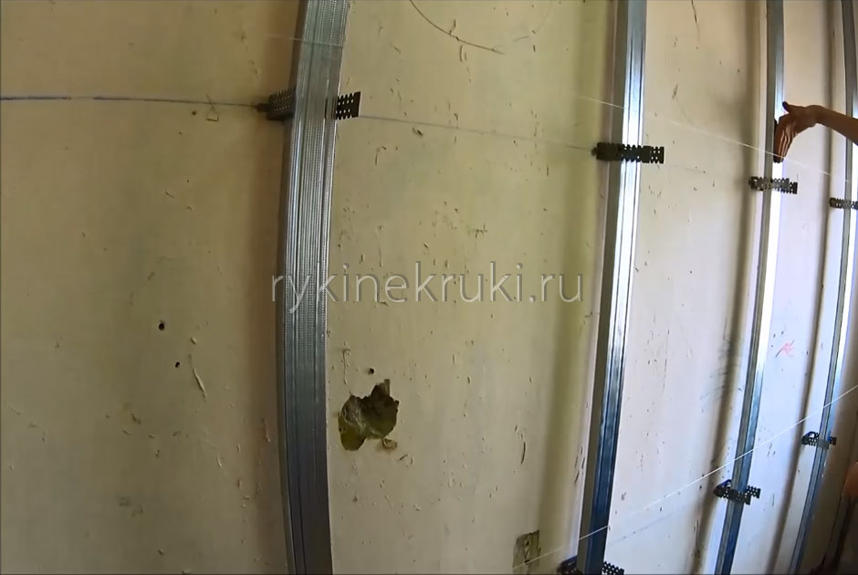 По завершении монтажа нитки снимаются. А выступающие концы П-образных подвесов загибаются внутрь, но это при условии, что стена не будет утепляться. Если будет укладываться утеплитель между профилями, то загибать подвесы рано – они еще пригодятся.