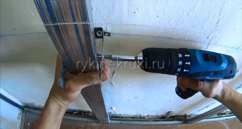 Приступаем к креплению – используем саморезы с пресс шайбой. Вставляем на биту шуруповерта саморез. Одной рукой держим профиль, другой вкручиваем с боковой стороны профиля через отверстие в подвесе саморез:
